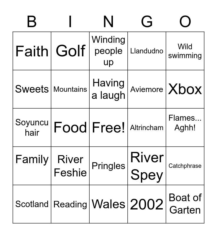 This bingo card has a free space and 34 words: 18, 2002, November, Cousins, Family, Mountains, Wild swimming, Scotland, Golf, Tennis, Having a laugh, Winding people up, Swansea City, Manchester, Altrincham, Xbox, Reading, Soyuncu hair, River Feshie, River Spey, Pringles, Church, Faith, Flames... Aghh!, Wales, Boat of Garten, Llandudno, Snowdonia, Aviemore, Sweets, Puddings, Food, Catchphrase and Competitive.