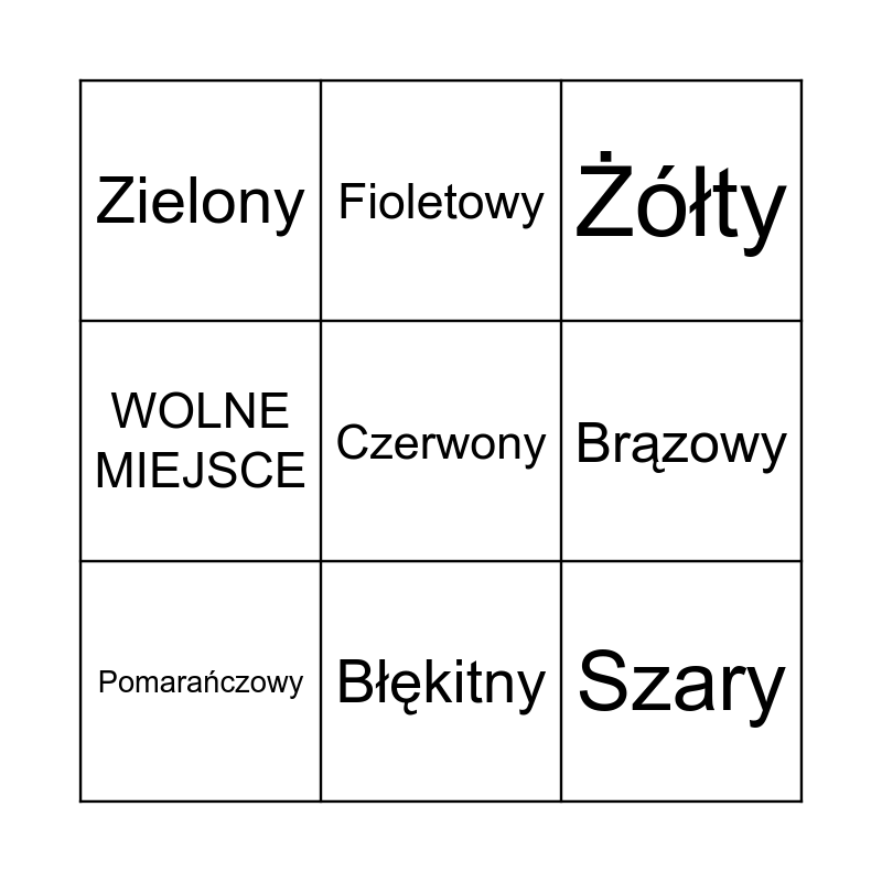 This bingo card has 13 words: Biały, Srebrny, Pomarańczowy, Fioletowy, WOLNE MIEJSCE, Czerwony, Szary, Granatowy, Błękitny, Zielony, Brązowy, Żółty and Złoty.