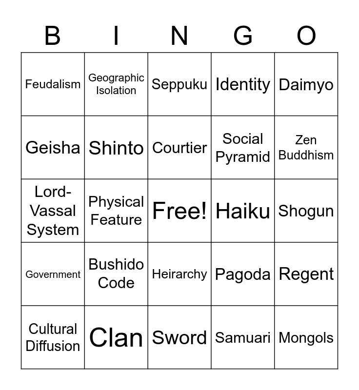 This bingo card has a free space and 24 words: Bushido Code, Clan, Courtier, Cultural Diffusion, Daimyo, Feudalism, Geisha, Geographic Isolation, Haiku, Heirarchy, Social Pyramid, Lord-Vassal System, Pagoda, Regent, Shinto, Samuari, Shogun, Seppuku, Zen Buddhism, Physical Feature, Mongols, Government, Identity and Sword.