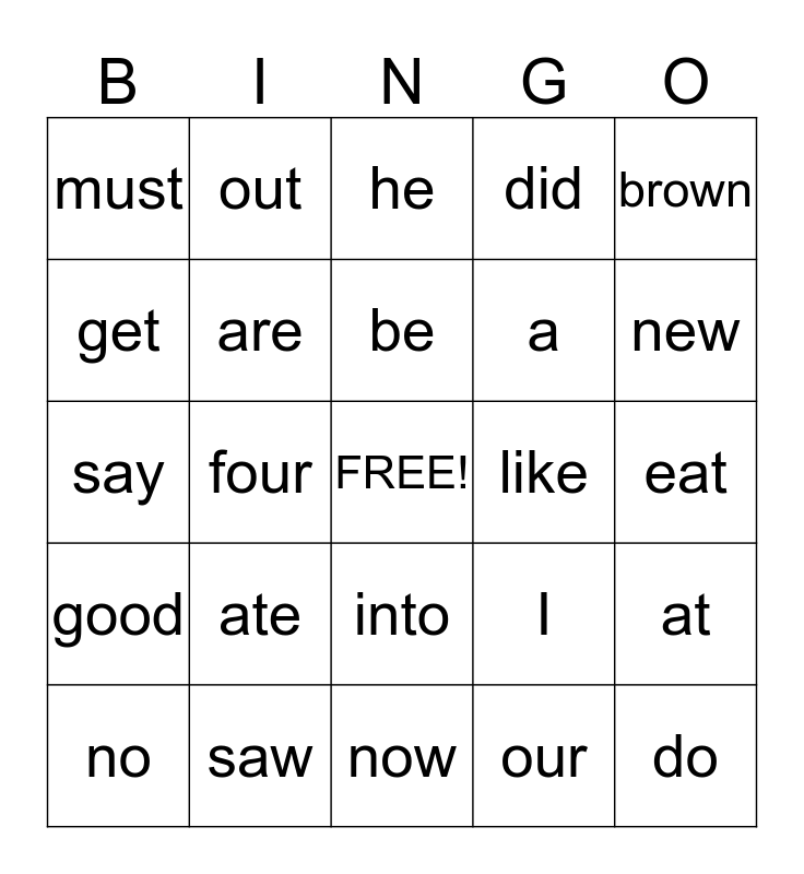 This bingo card has a free space and 37 words: came, all, am, are, at, ate, be, black, brown, but, four, did, do, eat, get, good, have, he, into, like, must, new, no, now, on, our, out, please, pretty, ran, ride, saw, say, the, I, a and is.