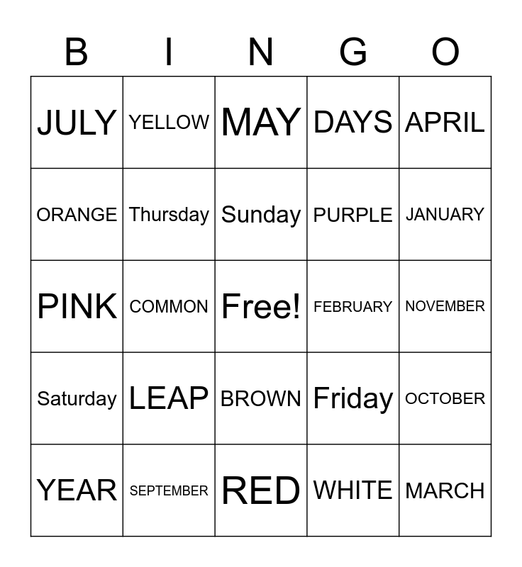 This bingo card has a free space and 36 words: Monday, Tuesday, Wednesday, Thursday, Friday, Saturday, Sunday, Birthday, APRIL, AUGUST, COMMON, DAYS, DECEMBER, FEBRUARY, JANUARY, JULY, JUNE, LEAP, MARCH, MAY, NOVEMBER, OCTOBER, SEPTEMBER, YEAR, RED, YELLOW, PINK, GREEN, PURPLE, ORANGE, BLUE, BLACK, WHITE, BROWN, GOLD and GREY.
