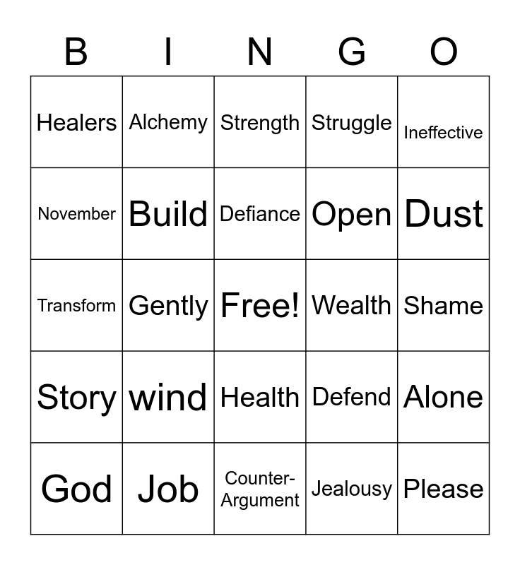 This bingo card has a free space and 24 words: wind, Job, Defiance, God, Ineffective, Healers, November, Alchemy, Wealth, Health, Open, Transform, Defend, Alone, Build, Jealousy, Shame, Strength, Dust, Gently, Please, Story, Struggle and Counter-Argument.