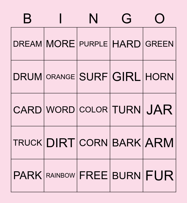 This bingo card has 25 words: TRUCK, RAINBOW, COLOR, BURN, GREEN, DREAM, MORE, PURPLE, TURN, ARM, DRUM, ORANGE, FREE, BARK, HORN, PARK, WORD, SURF, GIRL, JAR, CARD, DIRT, CORN, HARD and FUR.