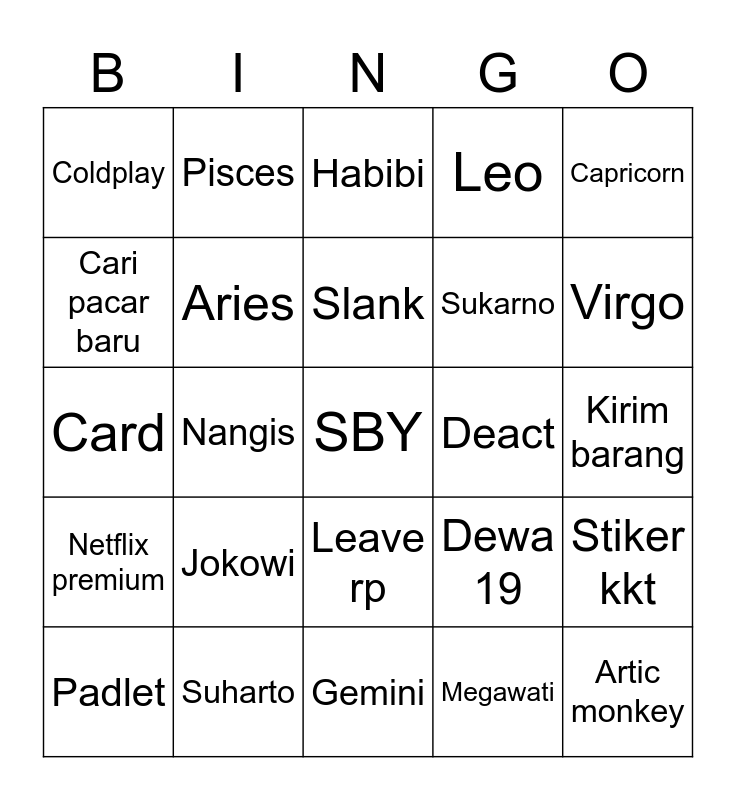 This bingo card has a free space and 24 words: Jokowi, Suharto, Slank, Padlet, Capricorn, Coldplay, Cari pacar baru, Pisces, Deact, Leave rp, Sukarno, Card, Dewa 19, Stiker kkt, Aries, Megawati, Kirim barang, Habibi, Virgo, Nangis, Artic monkey, Netflix premium, Leo and Gemini.