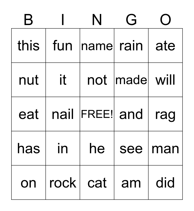 This bingo card has a free space and 24 words: in, rock, not, on, ate, this, nut, fun, and, he, made, eat, see, man, it, am, rag, name, will, nail, did, has, rain and cat.