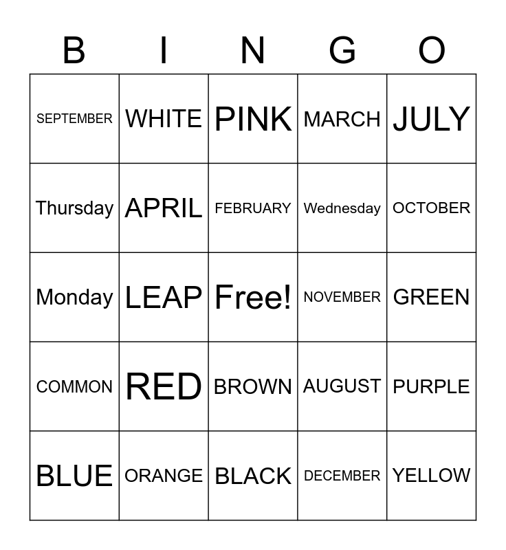 This bingo card has a free space and 36 words: Saturday, Sunday, Birthday, APRIL, AUGUST, COMMON, FEBRUARY, JANUARY, JULY, JUNE, LEAP, MARCH, MAY, NOVEMBER, OCTOBER, SEPTEMBER, YEAR, RED, YELLOW, PINK, GREEN, PURPLE, ORANGE, BLUE, BLACK, WHITE, Monday, Tuesday, Wednesday, Thursday, Friday, DAYS, DECEMBER, BROWN, GOLD and GREY.