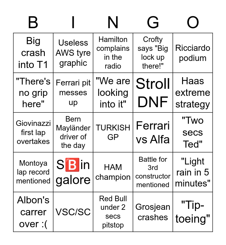 This bingo card has a free space and 24 words: S🅱in galore, VSC/SC, "We are looking into it", Albon's carrer over :(, Ricciardo podium, Big crash into T1, "There's no grip here", Useless AWS tyre graphic, Ferrari vs Alfa, HAM champion, Stroll DNF, Giovinazzi first lap overtakes, Battle for 3rd constructor mentioned, "Light rain in 5 minutes", Ferrari pit messes up, Grosjean crashes, "Two secs Ted", Hamilton complains in the radio, Haas extreme strategy, Bern Mayländer driver of the day, "Tip-toeing", Montoya lap record mentioned, Crofty says "Big lock up there!" and Red Bull under 2 secs pitstop.