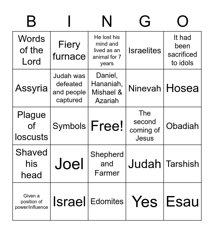 This bingo card has a free space and 33 words: Prophet and priest, Watchman, Symbols, 390, 8, Shaved his head, Judah was defeated and people captured, It had been sacrificed to idols, Given a position of power/influence, Fiery furnace, Refused to bow down to an idol, Daniel, Hananiah, Mishael & Azariah, He lost his mind and lived as an animal for 7 years, He continued praying to God, Handwriting, The second coming of Jesus, Hosea, Israel, Plague of loscusts, Joel, Judah, Shepherd and Farmer, Amos, Words of the Lord, Obadiah, Edomites, Esau, Israelites, Ninevah, Assyria, Tarshish, 3, Yes and False prophets.