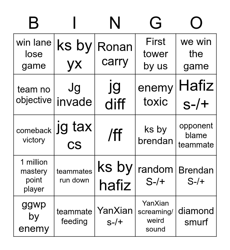 This bingo card has a free space and 24 words: teammates run down, teammate feeding, jg diff, ggwp by enemy, we win the game, win lane lose game, team no objective, ks by yx, ks by brendan, ks by hafiz, enemy toxic, comeback victory, random S-/+, Brendan S-/+, Jg invade, YanXian screaming/ weird sound, opponent blame teammate, Ronan carry, Hafiz s-/+, jg tax cs, diamond smurf, 1 million mastery point player, First tower by us and YanXian s-/+.