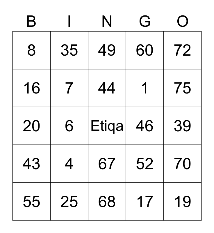 This bingo card has a free space and 24 words: 4, 25, 44, 55, 72, 8, 16, 35, 46, 67, 1, 20, 52, 70, 7, 17, 39, 49, 75, 6, 19, 43, 60 and 68.