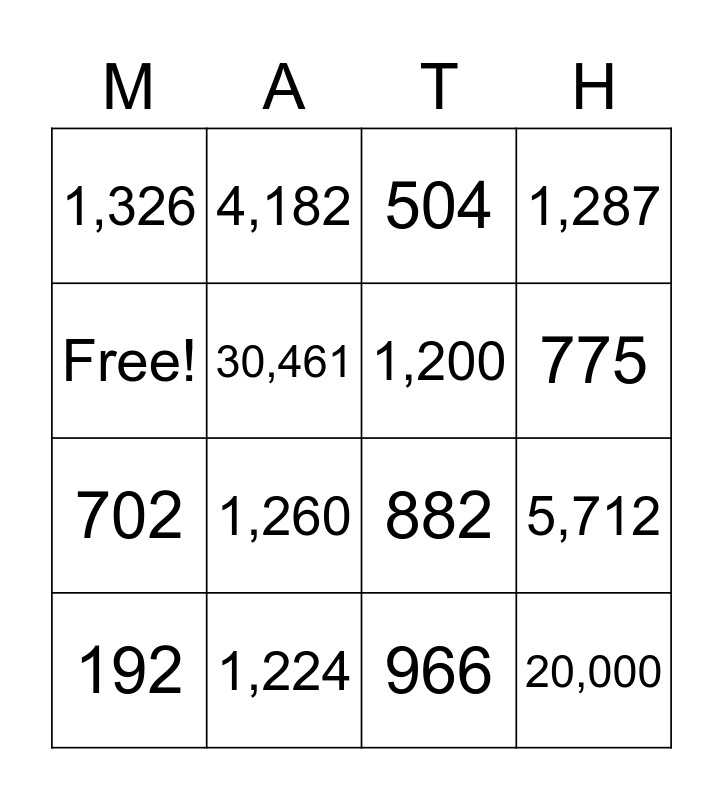 This bingo card has 16 words: 1,224, 5,712, 504, 1,326, 702, 4,182, 882, 966, Free!, 30,461, 192, 1,287, 1,260, 775, 1,200 and 20,000.