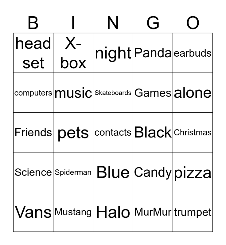 This bingo card has 25 words: Spiderman, Halo, Skateboards, Vans, earbuds, head set, computers, X-box, Black, Blue, Games, Friends, Candy, pizza, music, trumpet, Christmas, night, alone, pets, contacts, Mustang, Science, Panda and MurMur.