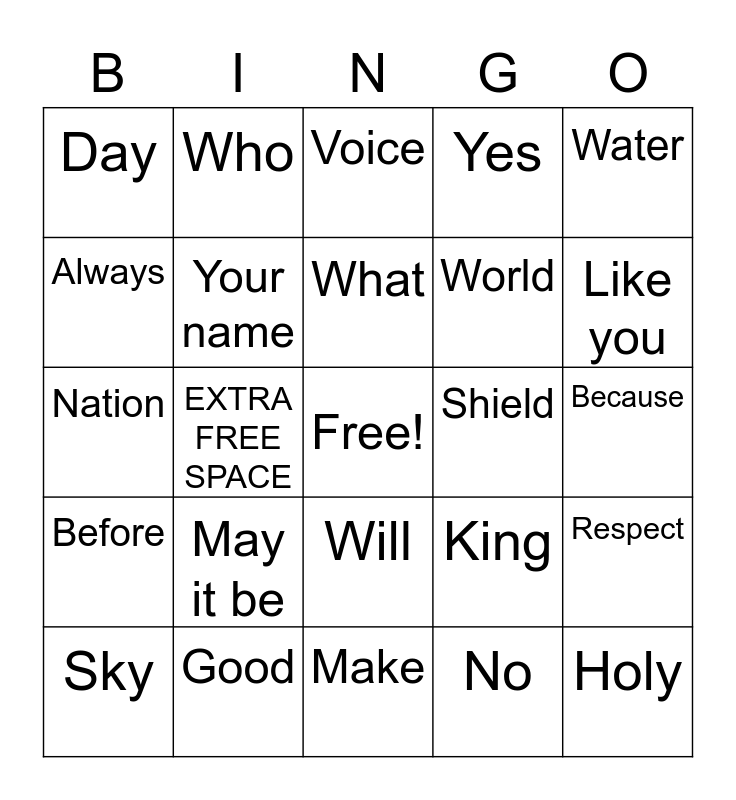 This bingo card has a free space and 24 words: May it be, Good, What, Sky, Water, Day, Always, Who, Shield, Will, World, Nation, King, Respect, Your name, No, Because, Voice, Like you, EXTRA FREE SPACE, Holy, Before, Yes and Make.