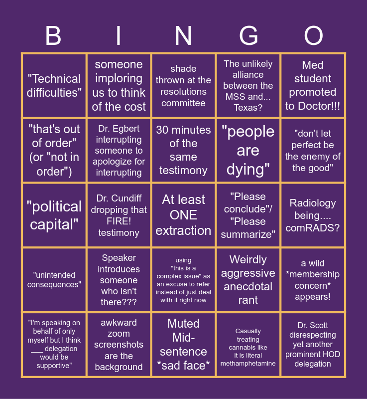 This bingo card has a free space and 29 words: "I'm speaking on behalf of only myself but I think ___ delegation would be supportive", Reporting "no conflicts of interest" before mentioning something that is definitely a conflict of interest, Dr. Cundiff dropping that FIRE! testimony, Battle lines are clearly drawn by PCP vs specialties in debate, "Technical difficulties", shade thrown at the resolutions committee, Dr. Egbert interrupting someone to apologize for interrupting, Speaker introduces someone who isn't there???, "Please conclude"/ "Please summarize", awkward zoom screenshots are the background, Radiology being.... comRADS?, Dr. Scott disrespecting yet another prominent HOD delegation, Muted Mid-sentence *sad face*, Casually treating cannabis like it is literal methamphetamine, "don't let perfect be the enemy of the good", Testifying just to give everyone advice on how to practice medicine..., using "this is a complex issue" as an excuse to refer instead of just deal with it right now, "unintended consequences", Med student promoted to Doctor!!!, "political capital", Weirdly aggressive anecdotal rant, pretending a term that's clearly defined in the relevant literature isn't clear enough, "people are dying", "that's out of order" (or "not in order"), The unlikely alliance between the MSS and... Texas?, someone imploring us to think of the cost, a wild *membership concern* appears!, 30 minutes of the same testimony and testimony that had you in the first half, not gonna lie.