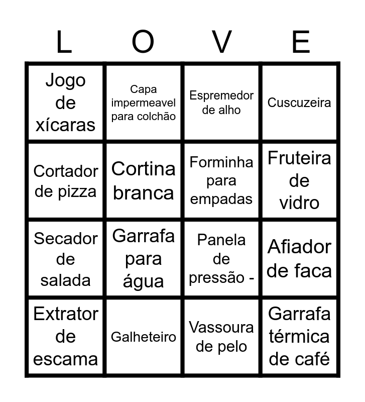 This bingo card has 107 words: Free!, Formas de gelo de silicone, Afiador de faca, Assadeira de pizza, Açucareiro, Balança de banheiro, Balança de cozinha, Balde de pipoca, Balde de plástico, Bandeja de cama, Batedor de ovos, Boleira, Bomboniere, Bule de café, Cafeteira, Caminho de mesa, Capa impermeavel para colchão, Carrinho de feira, Cesta de pão, Chaleira com apito, Coador de café, Conchas inox para caldos, Conjunto de peneiras, Conjunto de potes/bowls para caldo, Coqueteleira, Cortador de pizza, Cortina branca, Cuscuzeira, Cutelo, Descanso de panelas, Desentupidor de pia, Escorredor de arroz, Escorredor de macarrão inox, Escova para lavar roupa, Espanador de po, Espremedor de alho, Espremedor de batata, Espátula para bolo, Espátulas para patê, Extrator de escama, Forma de bolo de coração, Forma de bolo de silicone, Forma de pudim, Forma desmontável de bolo, Forma para tortas, Forminha para empadas, Fronhas, Fruteira de vidro, Funil, Galheteiro, Garfinhos para petisco, Garrafa para água, Garrafa térmica de café, Jarra para suco, Jogo americano, Jogo de facas e tesoura, Jogo de lençol casal, Jogo de tapete de banheiro, Jogo de Taça de vinho branco, Jogo de xícaras, Limpa vidros MOP, Luva térmica, Lixeira inox, Manta de casal Amarela, Manta de casal Vermelha, Moedor de pimenta, Organizador de prateleira, Organizador de pratos, Organizador de talher, Pa de lixo com Tampa, Paliteiro, Panela de pressão -, Panela Pipoqueira, Panos de chão, Panos de limpeza, Panos de prato, Panquequeira, Passadeira preta para cozinha, Pegador de salada, Petisqueira, Pincel culinário, Pirex de vidro, Porta frios, Potes de plástico multiuso, Potes de vidro, Prendedor, Prendedor de embalagens, Quebra nozes, Ralador, Saleiro e pimenteiro, Secador de salada, Socador, Suporte de filtro de café, Suqueira de vidro, Tampa para fritura, Taças de licor, Taças de sobremesa, Toalha de banho, Toalha de rosto, Toalha pra mesa retangular, Torradeira, Travessa com tampa, Tábua de carne, Tábua de passar roupa, Varal de parede retrátil, Vassoura de pelo and Vassoura de piaçava.