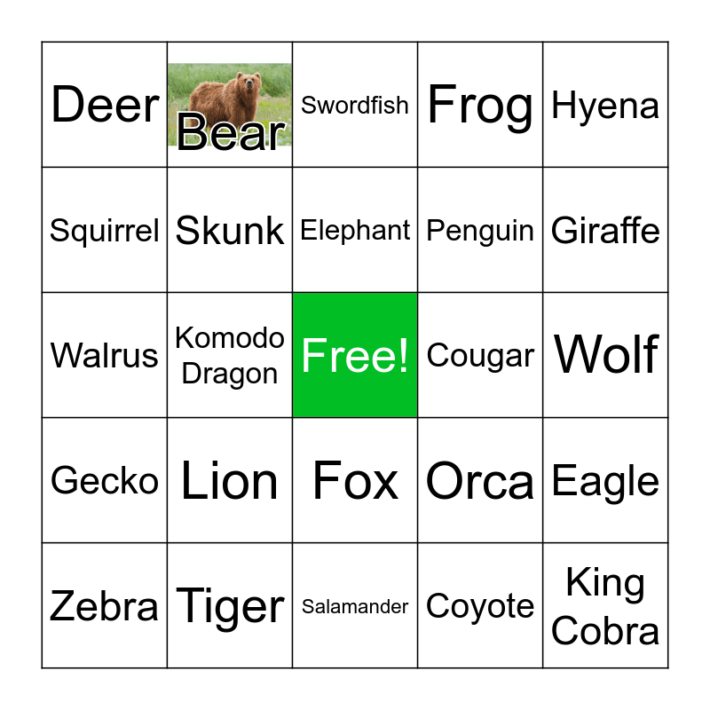 This bingo card has 1 images, a free space and 24 words: Lion, Tiger, Elephant, Zebra, Hyena, Deer, Squirrel, Bear, Cougar, Fox, Penguin, Walrus, Orca, Eagle, Skunk, Coyote, Wolf, Swordfish, Giraffe, Komodo Dragon, King Cobra, Gecko, Frog and Salamander.