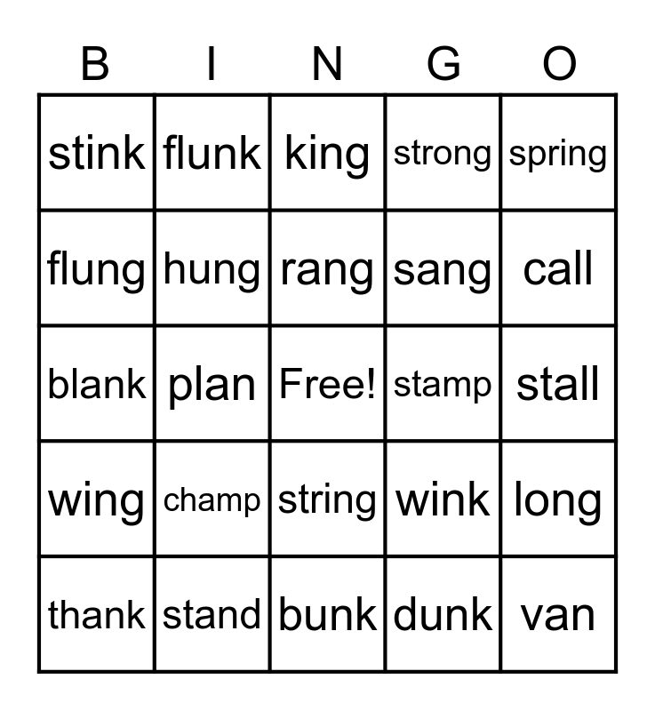 This bingo card has a free space and 24 words: champ, stand, rang, thank, spring, stink, flung, flunk, stamp, string, sang, blank, wink, long, hung, dunk, stall, king, call, plan, van, wing, strong and bunk.