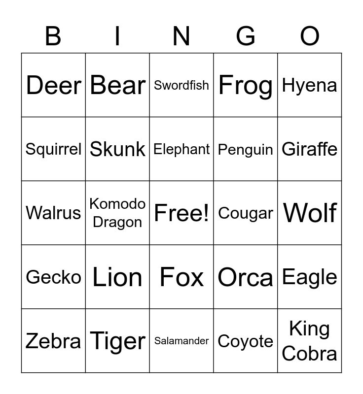 This bingo card has a free space and 24 words: Lion, Tiger, Elephant, Zebra, Hyena, Deer, Squirrel, Bear, Cougar, Fox, Penguin, Walrus, Orca, Eagle, Skunk, Coyote, Wolf, Swordfish, Giraffe, Komodo Dragon, King Cobra, Gecko, Frog and Salamander.
