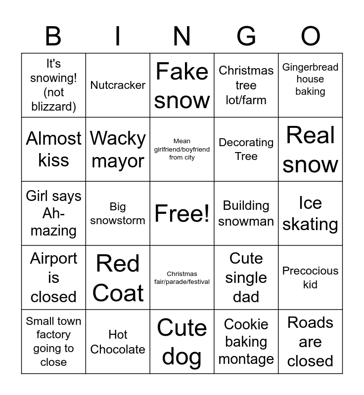 This bingo card has a free space and 24 words: Red Coat, Hot Chocolate, Mean girlfriend/boyfriend from city, Small town factory going to close, Gingerbread house baking, It's snowing! (not blizzard), Almost kiss, Nutcracker, Building snowman, Christmas fair/parade/festival, Decorating Tree, Girl says Ah-mazing, Cute single dad, Precocious kid, Wacky mayor, Cookie baking montage, Ice skating, Fake snow, Real snow, Big snowstorm, Roads are closed, Airport is closed, Christmas tree lot/farm and Cute dog.