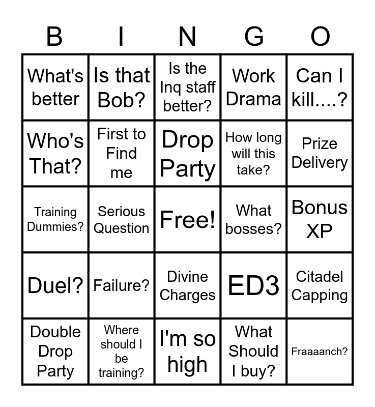 This bingo card has a free space and 24 words: Failure?, Where should I be training?, Drop Party, Double Drop Party, Can I kill....?, What's better, Who's That?, Is that Bob?, What bosses?, Divine Charges, How long will this take?, Training Dummies?, ED3, Citadel Capping, First to Find me, What Should I buy?, Bonus XP, Is the Inq staff better?, Prize Delivery, Serious Question, Fraaaanch?, Duel?, Work Drama and I'm so high.