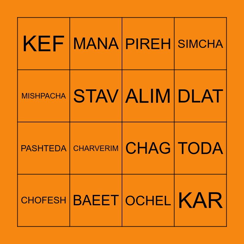 This bingo card has 19 words: CHAG, HODU, PIREH, KAR, TODA, MISHPACHA, OCHEL, KEF, MANA, PASHTEDA, CHARVERIM, STAV, ALIM, BAEET, CHOFESH, TAPUCHIM, SIMCHA, DLAT and BATATA.