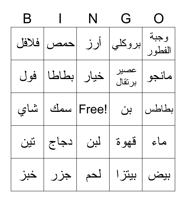 This bingo card has a free space and 24 words: دجاج, جزر, خيار, خبز, وجبة الفطور, فلافل, فول, حمص, بن, لبن, عصير برتقال, شاي, قهوة, ماء, بطاطا, بيتزا, بطاطس, أرز, مانجو, سمك, بيض, تين, بروكلي and لحم.