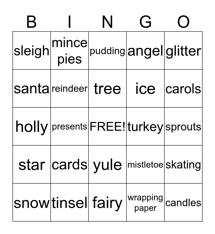 This bingo card has a free space and 24 words: cards, tinsel, tree, snow, glitter, sleigh, santa, mince pies, turkey, yule, ice, holly, mistletoe, skating, reindeer, wrapping paper, sprouts, pudding, carols, presents, candles, star, angel and fairy.