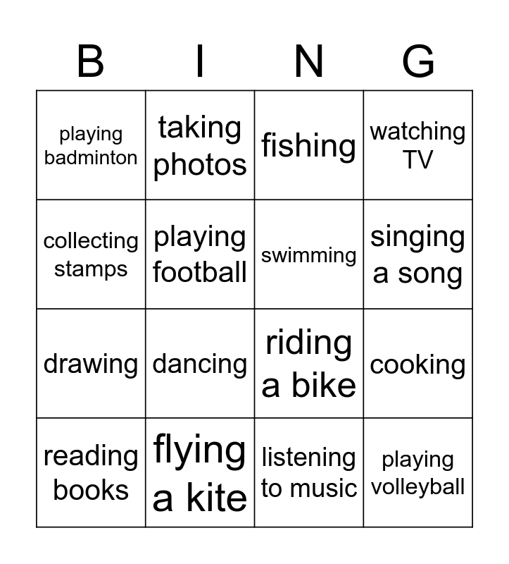 This bingo card has 16 words: flying a kite, cooking, fishing, playing badminton, drawing, taking photos, riding a bike, listening to music, collecting stamps, playing football, reading books, watching TV, dancing, singing a song, swimming and playing volleyball.