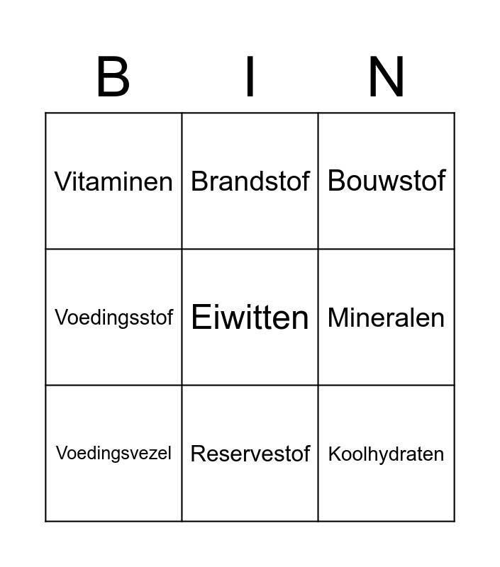 This bingo card has a free space and 12 words: Vetten, Water, Koolhydraten, Mineralen, Brandstof, Bouwstof, Reservestof, Beschermende stof, Vitaminen, Voedingsstof, Voedingsvezel and Voedigsmiddel.