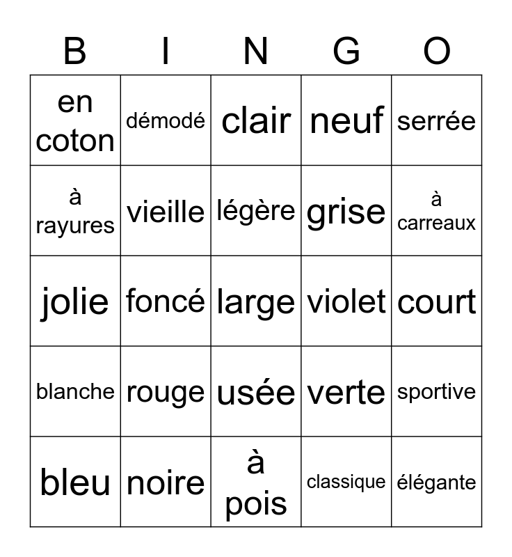 This bingo card has 32 words: classique, rose, foncé, long, blanche, vieille, serrée, sportive, démodé, élégante, légère, clair, à fleur, beau, violet, confortable, bleu, jolie, usée, rouge, verte, en soie, court, noire, large, neuf, grise, à rayures, en coton, à pois, en laine and à carreaux.