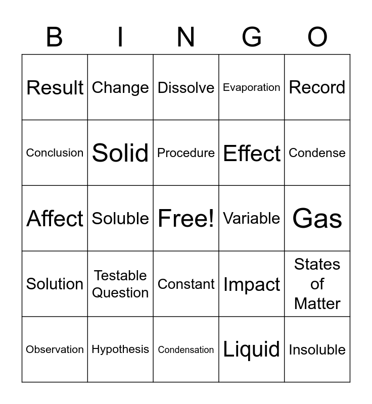 This bingo card has a free space and 24 words: Testable Question, Hypothesis, Procedure, Observation, Record, Result, Conclusion, Change, Variable, Constant, Effect, Affect, Impact, States of Matter, Solid, Liquid, Gas, Dissolve, Condense, Soluble, Insoluble, Solution, Evaporation and Condensation.