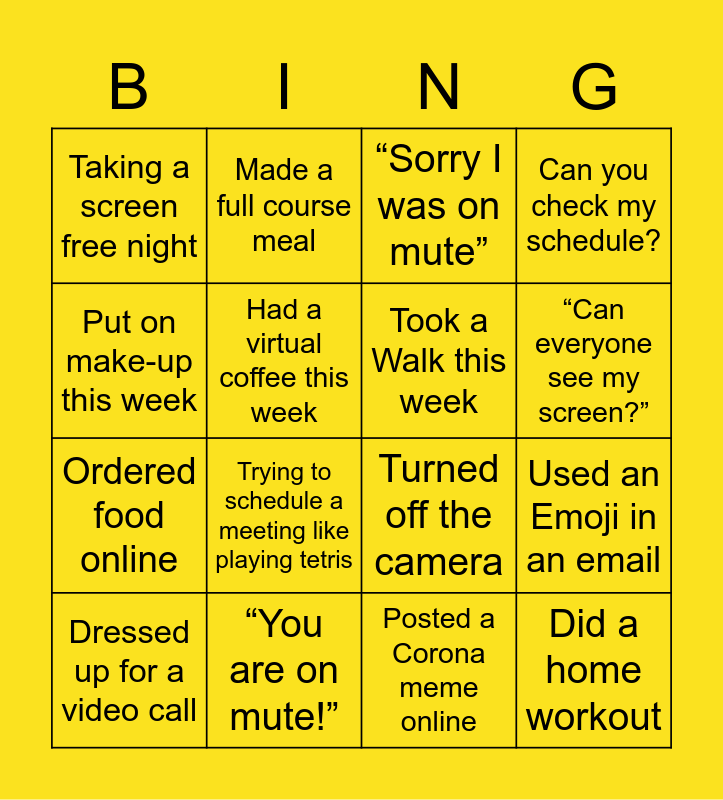 This bingo card has 62 words: Free!, Is your mic on?, Baked Bread This week, Did a home workout, Have attempted to make a Tiktok, Worked in PJ, Took a Walk this week, My wifi fell out, Ordered food online, Hold on, my cat need me, Can you check my schedule?, Took Stretch Breaks, Had a virtual coffee this week, “Just hang in there”, Had no social media break, Taking a screen free night, Dressed up for a video call, Put on make-up this week, Created a work-playlist, “Can everyone see my screen?”, “You are on mute!”, “Sorry I was on mute”, Seen a puppy this week, Been interrupted by a roommate or family, Did Chair Yoga, “Going on a walk”, Did Pamela Reif this week, People talking at the same time during call, “Call I call you real quick”, “Quick question”, Binged watched an entire season, Read a book, started meditating, Ordered way too much online, Posted a Corona meme online, Made a full course meal, Wore Yoga pants bottom during meetings, Send a GIF to a co-worker, Used an Emoji in an email, Saw a co-worker in person, Turned off the camera, Saw someone trying to talk on mute for 5 min, Did house chores on mute, Took picture of their food, Trying to schedule a meeting like playing tetris, Took a coffee break.. or 3, Sory, go ahead, Hello? Hello?, No it’s still loading, Sorry I have to jump on another call, *Loud typing in a video call, Sorry I’m late I was stuck in another call, Is the IO signed?, Can we take this offline?, Sorry I didn’t catch that or was it just me?, You are breaking up, Next slide please, Hi Who just joined?, I’m in the call, Is everyone here?, Can everyone else please mute? and I miss the office.
