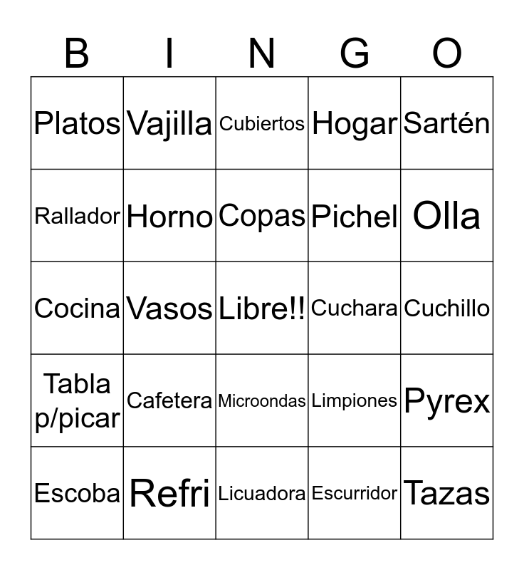 This bingo card has a free space and 24 words: Cafetera, Refri, Copas, Escoba, Sartén, Platos, Rallador, Vajilla, Cuchara, Microondas, Pichel, Cocina, Limpiones, Pyrex, Horno, Escurridor, Cuchillo, Cubiertos, Olla, Vasos, Tazas, Tabla p/picar, Hogar and Licuadora.