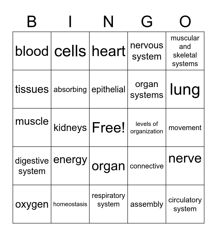 This bingo card has a free space and 24 words: energy, homeostasis, epithelial, oxygen, muscular and skeletal systems, blood, tissues, cells, levels of organization, organ, organ systems, muscle, connective, nerve, absorbing, assembly, movement, heart, lung, kidneys, circulatory system, digestive system, nervous system and respiratory system.