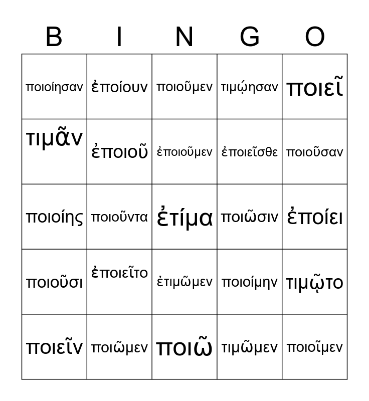 This bingo card has a free space and 39 words: ποιοῖσθε, ποιεῖσθαι, ποιουσῶν, ἐποιοῦ, ποιεῖν, ἐτιμῶμεν, ἐποιοῦμεν, ποιῇ, ποιεῖ, ποιοῦσι, ποιοῦντα, τιμῴησαν, ποιοῖμεν, ἐποίει, ποιῶσιν, ἐποιεῖτο, ἐτιμᾶσθε, ποιοίησαν, τιμῷεν, ποιοίμην, τιμᾶν, ποιῶ, ἐποιεῖσθε, ποιοῦσαν, τιμᾷ, τιμῶν, τιμῴμην, τιμῶσι(ν), ποιώμεθα, ἐποίουν, ποιοῦν, τιμῶντες, ποιοῦμεν, ποιῶμεν, τιμῶμεν, τιμῷμεν, τιμῷτο, ποιοίης and τιμῷ.