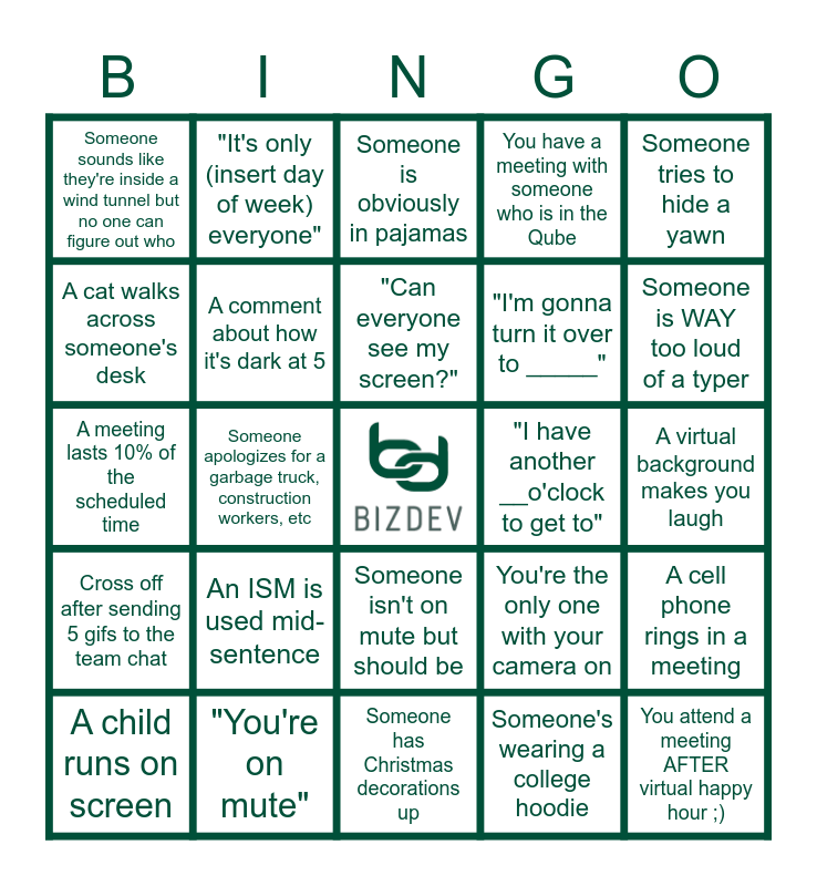 This bingo card has a free space and 24 words: An ISM is used mid-sentence, "You're on mute", "Can everyone see my screen?", A child runs on screen, Someone tries to hide a yawn, Someone sounds like they're inside a wind tunnel but no one can figure out who, A cat walks across someone's desk, "It's only (insert day of week) everyone", "I have another __o'clock to get to", Someone isn't on mute but should be, "I'm gonna turn it over to _____", A meeting lasts 10% of the scheduled time, You're the only one with your camera on, A cell phone rings in a meeting, A comment about how it's dark at 5, Someone's wearing a college hoodie, A virtual background makes you laugh, Someone is obviously in pajamas, Someone is WAY too loud of a typer, Someone apologizes for a garbage truck, construction workers, etc, You attend a meeting AFTER virtual happy hour ;), Cross off after sending 5 gifs to the team chat, You have a meeting with someone who is in the Qube and Someone has Christmas decorations up.