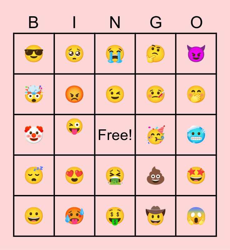 This bingo card has a free space and 29 words: 😀, 😂, 😜, 🤓, 😎, 😭, 😡, 😍, 🥳, 🥵, 🥶, 😱, 🤑, 🤠, 🤭, 🤫, 🤮, 😴, 😈, 🤡, 💩, ☠️, 🤒, 🤯, 🤔, 🥺, 🤩, 😉 and 😏.