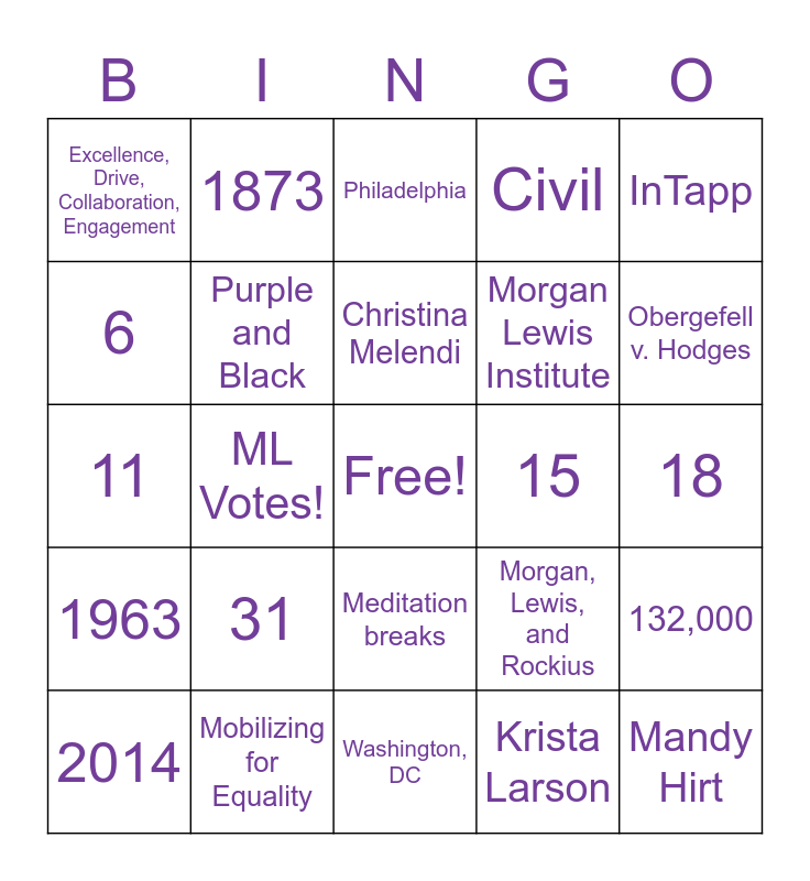 This bingo card has a free space and 24 words: 2014, 31, Christina Melendi, Krista Larson, InTapp, Excellence, Drive, Collaboration, Engagement, 1873, Philadelphia, 15, 18, 11, Purple and Black, Morgan, Lewis, and Rockius, 132,000, 6, Mobilizing for Equality, Washington, DC, Civil, Obergefell v. Hodges, 1963, ML Votes!, Meditation breaks, Morgan Lewis Institute and Mandy Hirt.