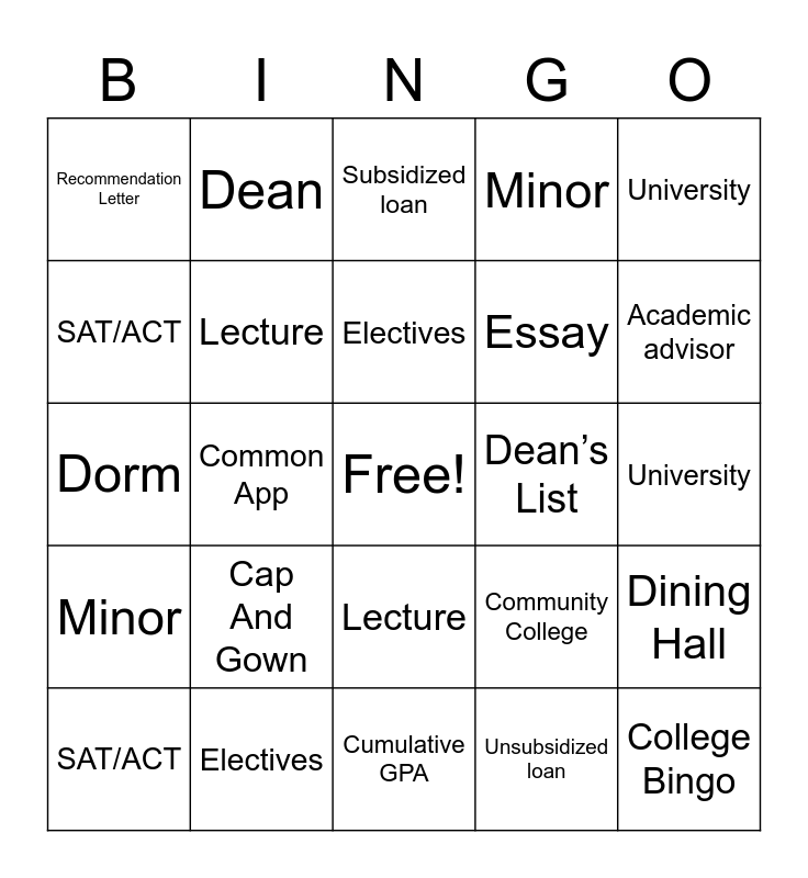 This bingo card has a free space and 48 words: Bachelor's Degree, College Bingo, Dorm, Cumulative GPA, Cap And Gown, Major, Dean, Academic advisor, SAT/ACT, Mascot, Lecture, Minor, Dining Hall, Community College, FAFSA, Grants, Electives, Dean’s List, Financial Aid, University, Common App, Unsubsidized loan, Recommendation Letter, Essay, Dean, Academic advisor, SAT/ACT, Mascot, Lecture, Minor, Dining Hall, Community College, FAFSA, Grants, Electives, Dean’s List, Financial Aid, University, Common App, Unsubsidized loan, Recommendation Letter, Essay, Subsidized loan, Major, Dorm, Cumulative GPA, Cap And Gown and Bachelor's Degree.