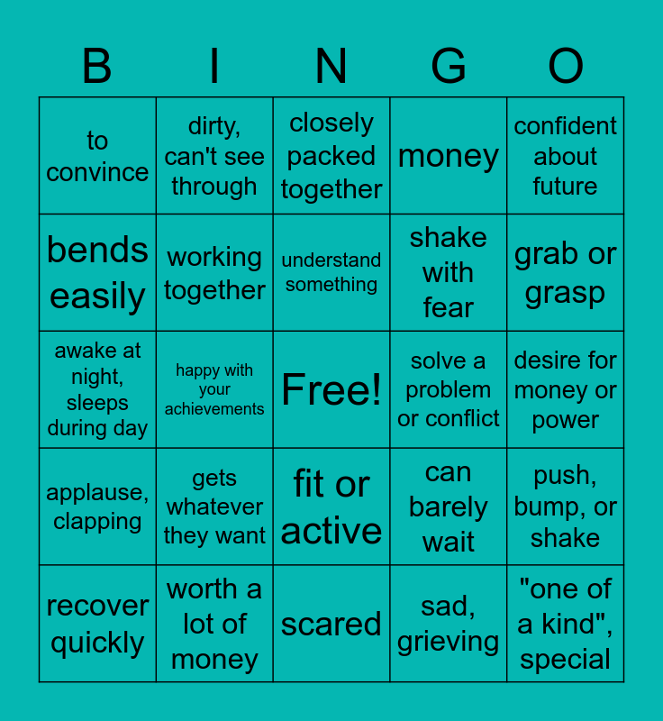 This bingo card has a free space and 29 words: recover quickly, talks a lot, happy with your achievements, clean, organized, to convince, closely packed together, working together, gets whatever they want, solve a problem or conflict, worth a lot of money, desire for money or power, "one of a kind", special, scared, sad, grieving, grab or grasp, very angry, fit or active, applause, clapping, confident about future, awake at night, sleeps during day, can barely wait, walk slow with heavy steps, shake with fear, bends easily, money, dirty, can't see through, push, bump, or shake, understand something and burning hot.