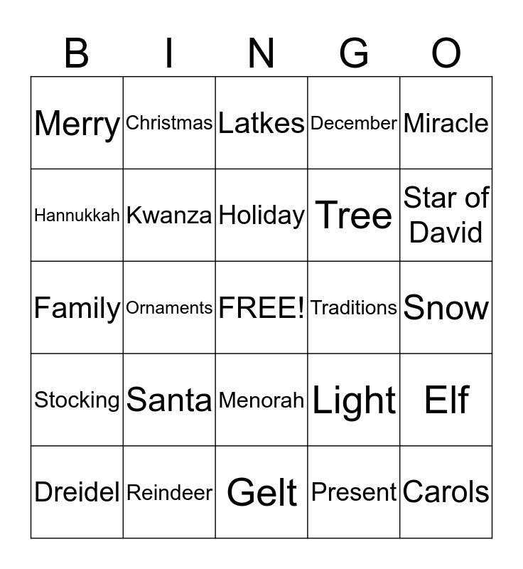 This bingo card has a free space and 24 words: Santa, Reindeer, Holiday, Dreidel, Miracle, Merry, Hannukkah, Christmas, Traditions, Menorah, Tree, Family, Light, Elf, Kwanza, Present, Snow, Latkes, Star of David, Ornaments, Carols, Stocking, December and Gelt.