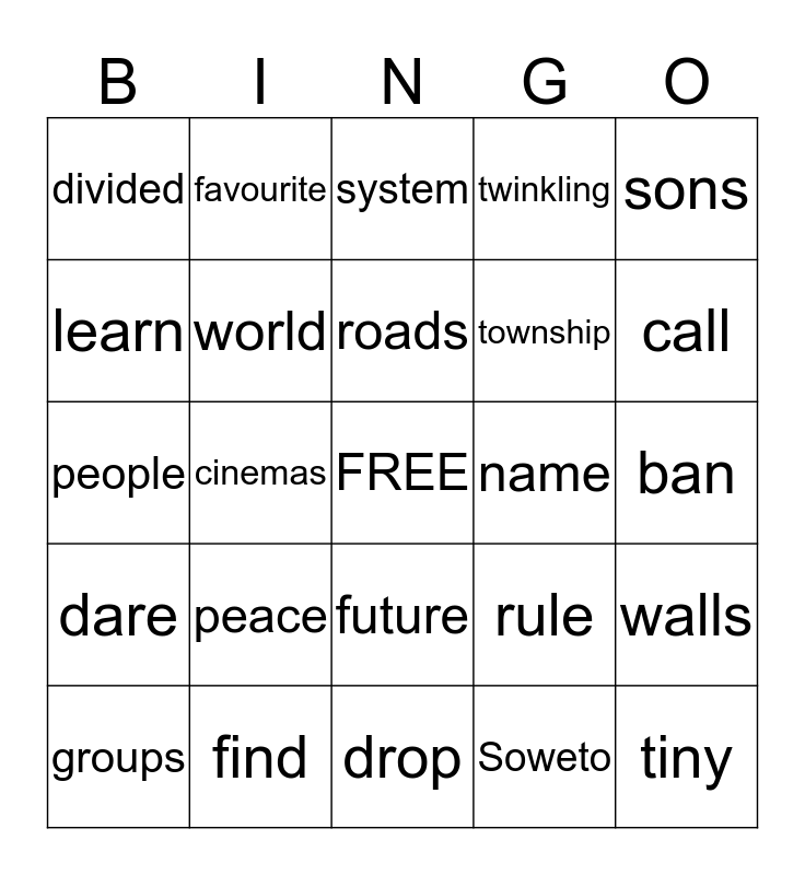 This bingo card has a free space and 24 words: peace, find, roads, groups, sons, divided, learn, favourite, name, future, township, people, rule, walls, world, Soweto, ban, system, call, cinemas, tiny, dare, twinkling and drop.