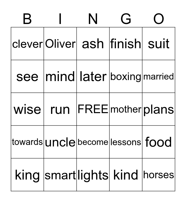 This bingo card has a free space and 24 words: uncle, smart, later, king, suit, clever, see, Oliver, mother, become, boxing, wise, lessons, food, mind, kind, plans, ash, married, run, horses, towards, finish and lights.