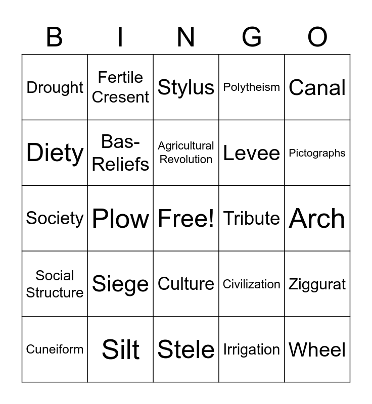 This bingo card has a free space and 26 words: Culture, Irrigation, Agricultural Revolution, Silt, Canal, Drought, Diety, Fertile Cresent, Arch, Civilization, Levee, Society, Ziggurat, Cuneiform, Plow, Climate, Polytheism, Social Structure, Stylus, Wheel, Pictographs, Stele, Tribute, Siege, Bas-Reliefs and Bronze.