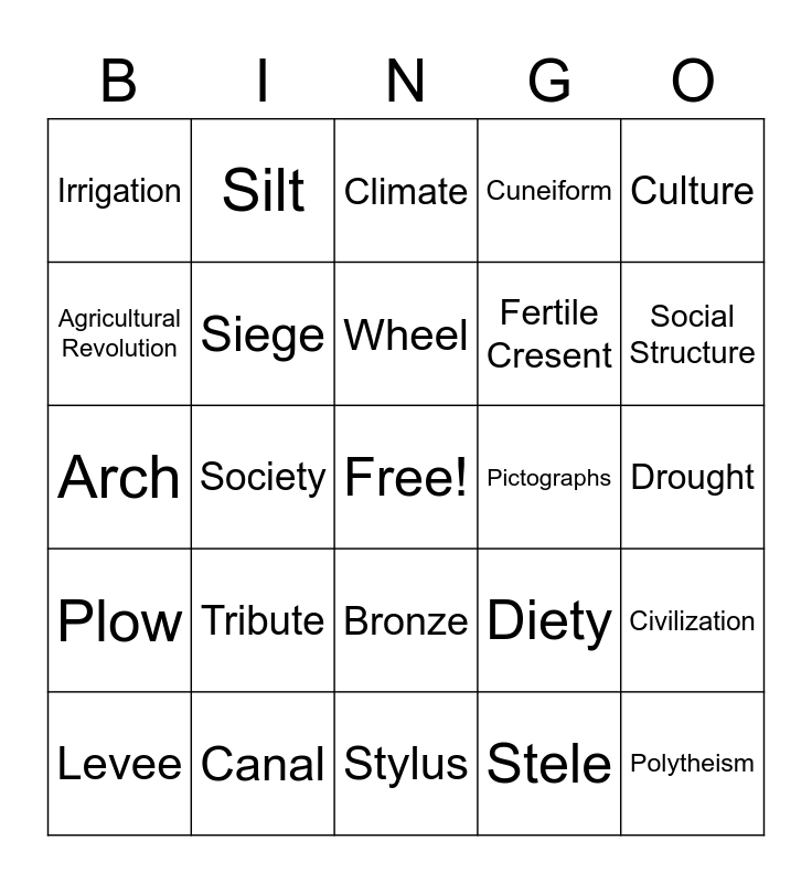 This bingo card has a free space and 26 words: Bronze, Stele, Wheel, Canal, Culture, Irrigation, Agricultural Revolution, Silt, Drought, Diety, Fertile Cresent, Arch, Civilization, Levee, Society, Ziggurat, Cuneiform, Plow, Climate, Polytheism, Social Structure, Stylus, Pictographs, Tribute, Siege and Bas-Reliefs.