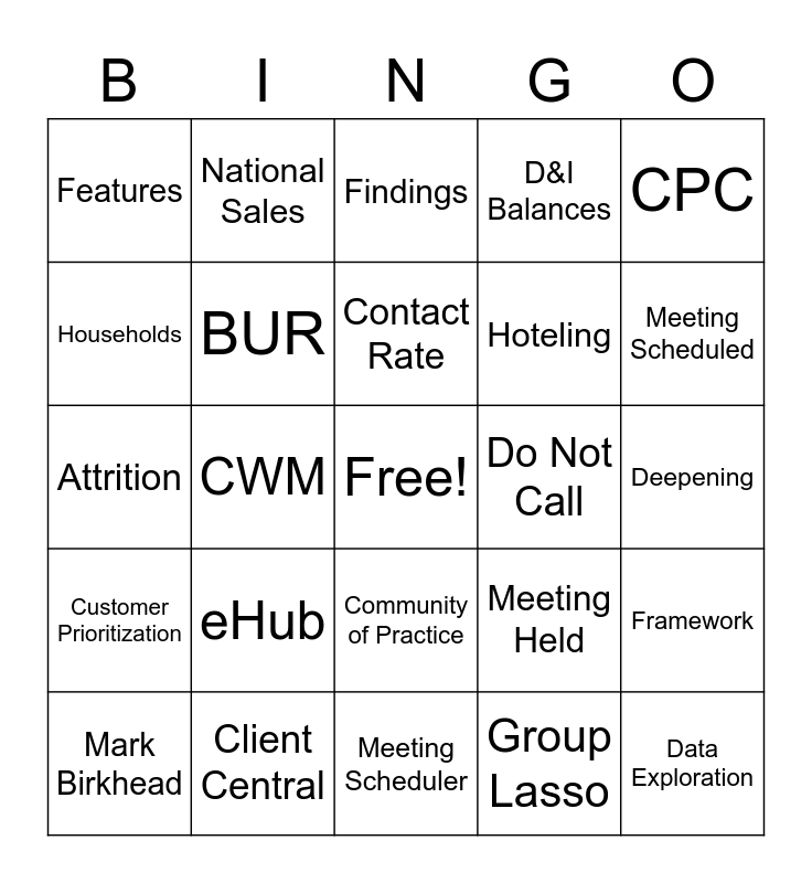 This bingo card has a free space and 40 words: Acquisition, Attrition, Banker Productivity, BUR, Client Central, Community of Practice, Contact Rate, Control Group, CPC, Customer Prioritization, CWM, D&I Balances, Data Exploration, Deepening, Do Not Call, eHub, Etc Etc, Features, Federated, Findings, Framework, Group Lasso, Hoteling, Households, Incentives, Insights, Kmeans, KNN, Leader(s), Leads, Logistic, Mark Birkhead, Measurement, Meeting Held, Meeting Scheduled, Meeting Scheduler, Methodology, Mining, National Sales and Neural Networks.