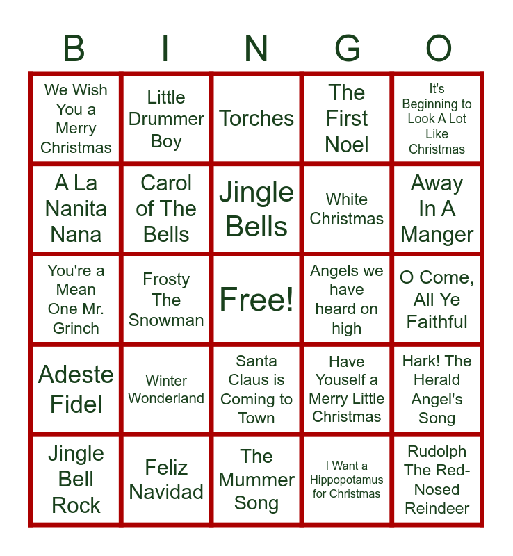 This bingo card has a free space and 25 words: Winter Wonderland, The Mummer Song, Jingle Bells, Jingle Bell Rock, It's Beginning to Look A Lot Like Christmas, We Wish You a Merry Christmas, A La Nanita Nana, Little Drummer Boy, Angels we have heard on high, Santa Claus is Coming to Town, White Christmas, You're a Mean One Mr. Grinch, Have Youself a Merry Little Christmas, Hark! The Herald Angel's Song, Carol of The Bells, Once In Royal David's City, O Come, All Ye Faithful, Torches, Away In A Manger, Frosty The Snowman, Rudolph The Red-Nosed Reindeer, Feliz Navidad, Adeste Fidel, The First Noel and I Want a Hippopotamus for Christmas.