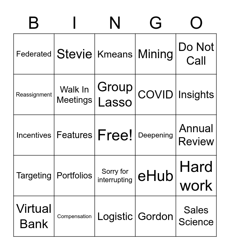 This bingo card has a free space and 100 words: 2021, Acquisition, Annual Review, Arielle, Around the Horn, Attrition, Backfill open recs, Banker Productivity, BI, BUR, Client Central, COE, Community of Practice, Compensation, Contact Rate, Control Group, COVID, CPC, Customer Prioritization, CWM, D&I Balances, Dashboard(s), Data Curation, Data Exploration, Data Scientist, Deepening, Do Not Call, eHub, EMR, Etc Etc, Features, Federated, Findings, Framework, Gordon, Group Lasso, Hard work, Holdout, Holidays, Hoteling, Households, Housekeeping, Incentives, India Team, Insights, Kmeans, KNN, Leader(s), Leads, Logistic, Machine Learning, Mark Birkhead, Matt Kane, Measurement, Meeting Held, Meeting Scheduled, Meeting Scheduler, Metadata, Methodology, Mining, MLT, Model, My Other Job, National Sales, Neural Networks, Non-Lead Calls, NPV, Ohio State, Opportunity, PCB, Planning, Portfolios, Prioritization, PTO, PVCs, Racquel, RB, Reassignment, Reporting, Retention, Roadmap, Sales Science, SalesForce, Sorry for interrupting, Staffing, Stevie, Strategy, T, Tableau, Targeting, Thank you, Time Preference, Value of a Banker, Virtual Bank, Walk In Meetings, Walk Ons, Welcome New Team Members, Work From Home, XGB and Zoom.