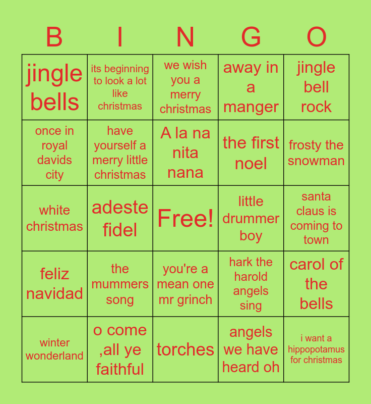 This bingo card has a free space and 24 words: winter wonderland, the mummers song, A la na nita nana, angels we have heard oh, jingle bell rock, jingle bells, its beginning to look a lot like christmas, we wish you a merry christmas, little drummer boy, santa claus is coming to town, white christmas, have yourself a merry little christmas, hark the harold angels sing, carol of the bells, once in royal davids city, o come ,all ye faithful, torches, away in a manger, frosty the snowman, feliz navidad, adeste fidel, you're a mean one mr grinch, the first noel and i want a hippopotamus for christmas.