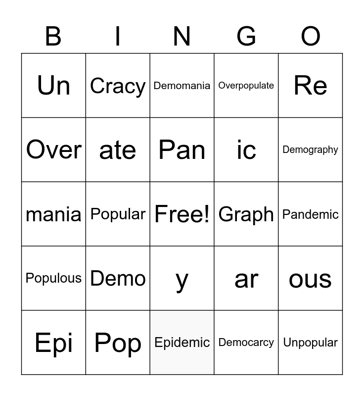 This bingo card has a free space and 24 words: Demo, Pop, Pan, Epi, Re, Un, Over, Cracy, Graph, y, ic, mania, ar, ous, ate, Democarcy, Pandemic, Demomania, Demography, Popular, Unpopular, Populous, Overpopulate and Epidemic.